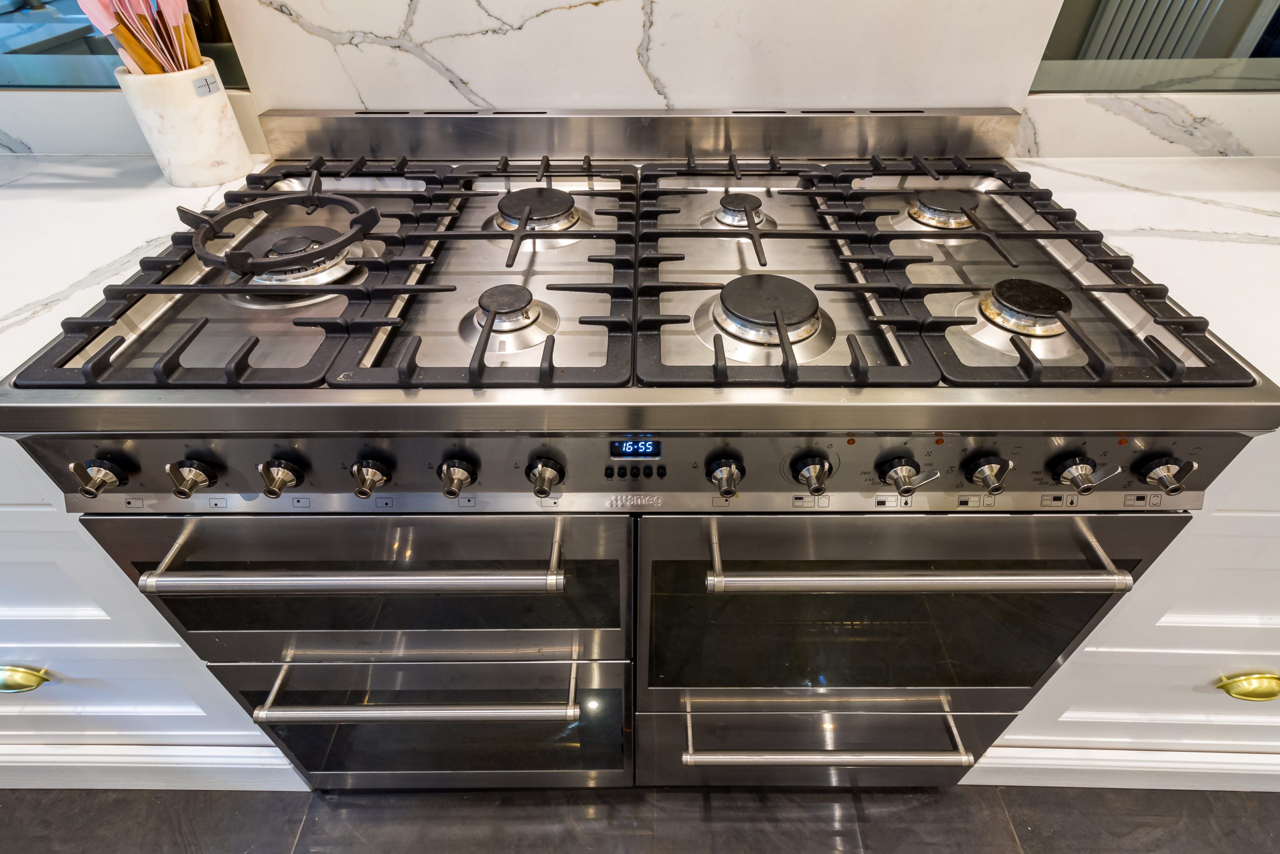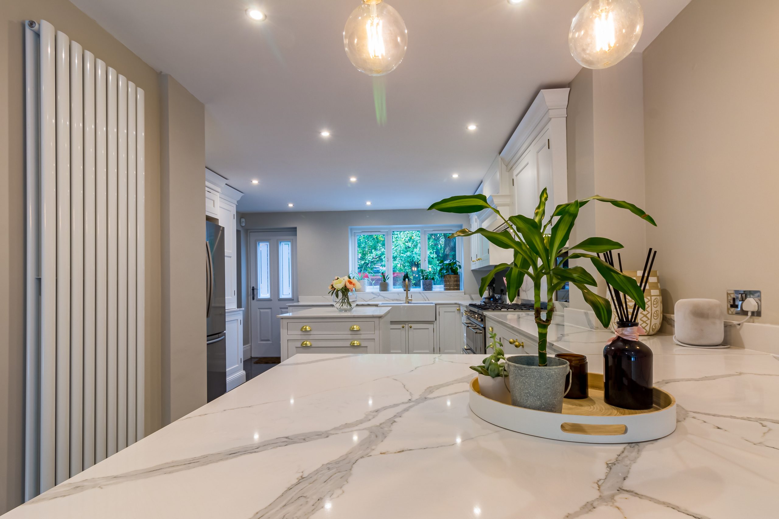 A 20mm quartz Calacatta range worktop runs throughout the room, giving lots of useful working space and a quality finish to this beautiful kitchen installation.
