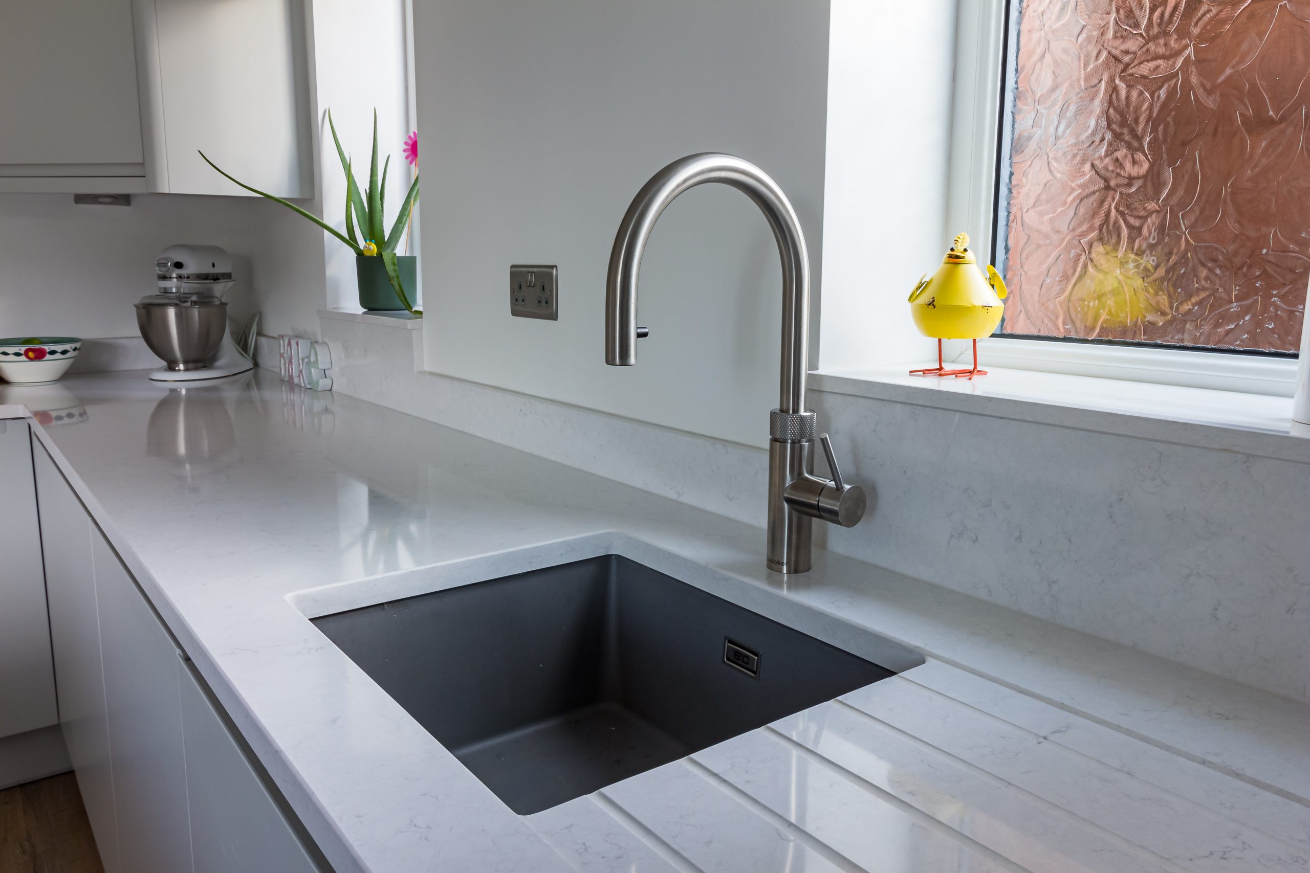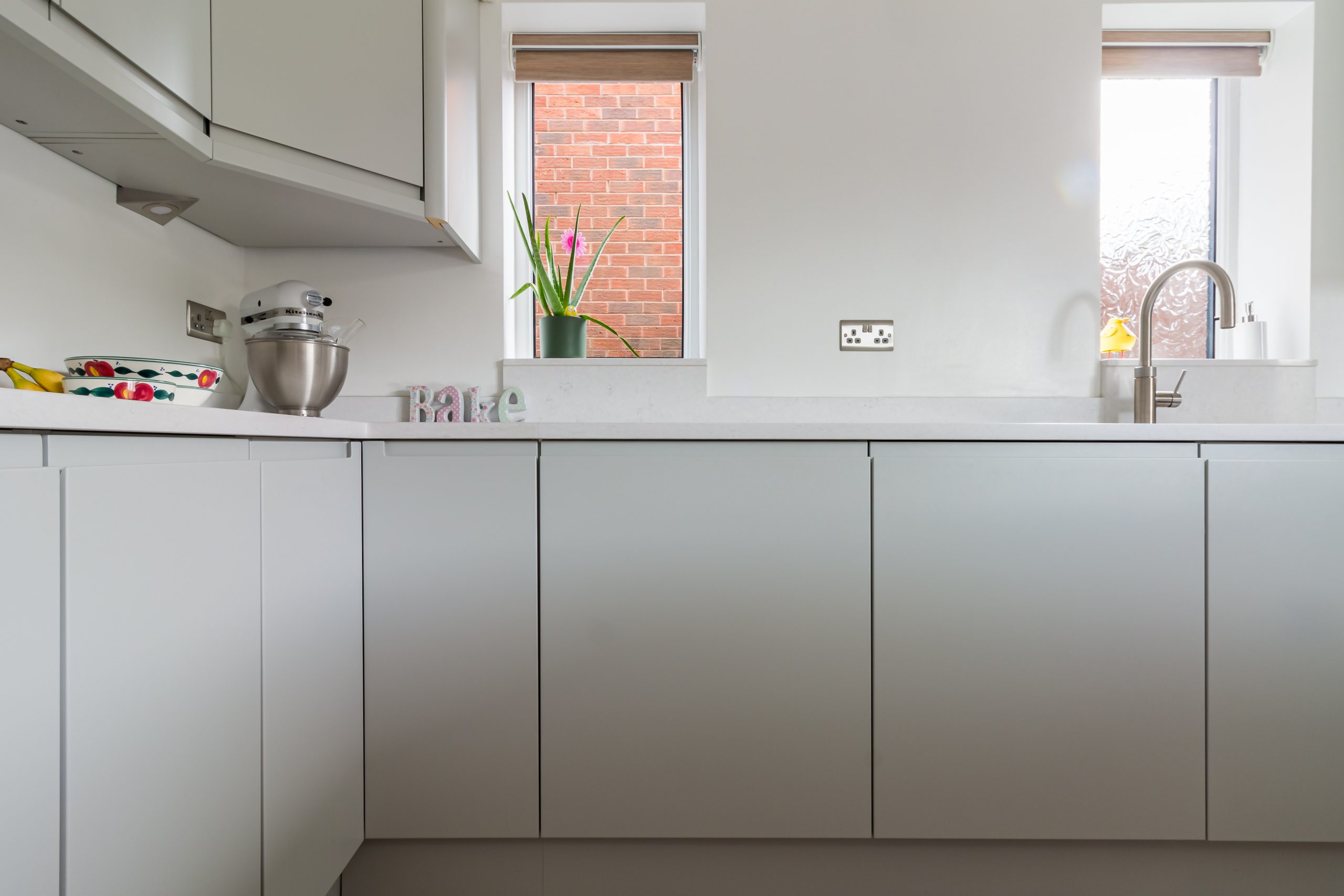 The choice of Dove grey matt doors and drawers gives a really airy and soft feel to the room, making the most of the available light from outside. Using curved doors has softened the edges further, resulting in a very welcoming and open space.