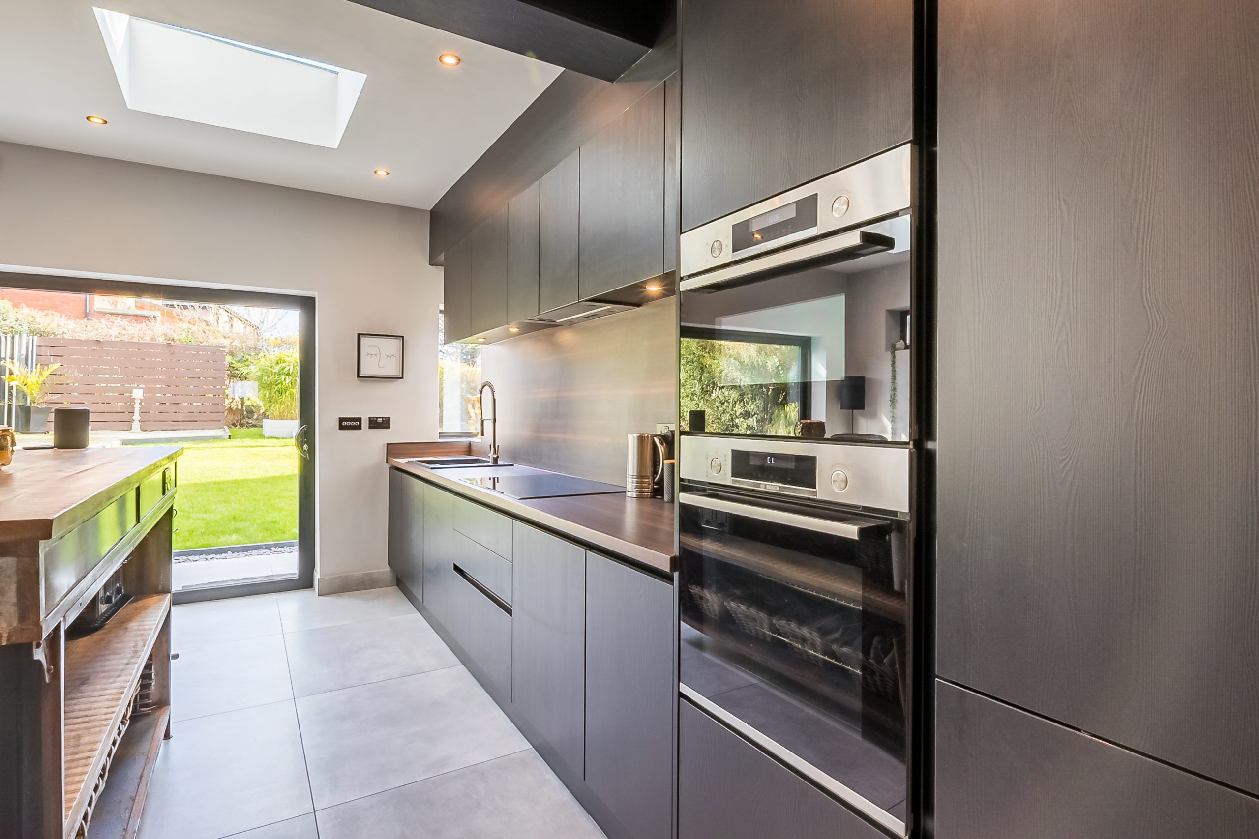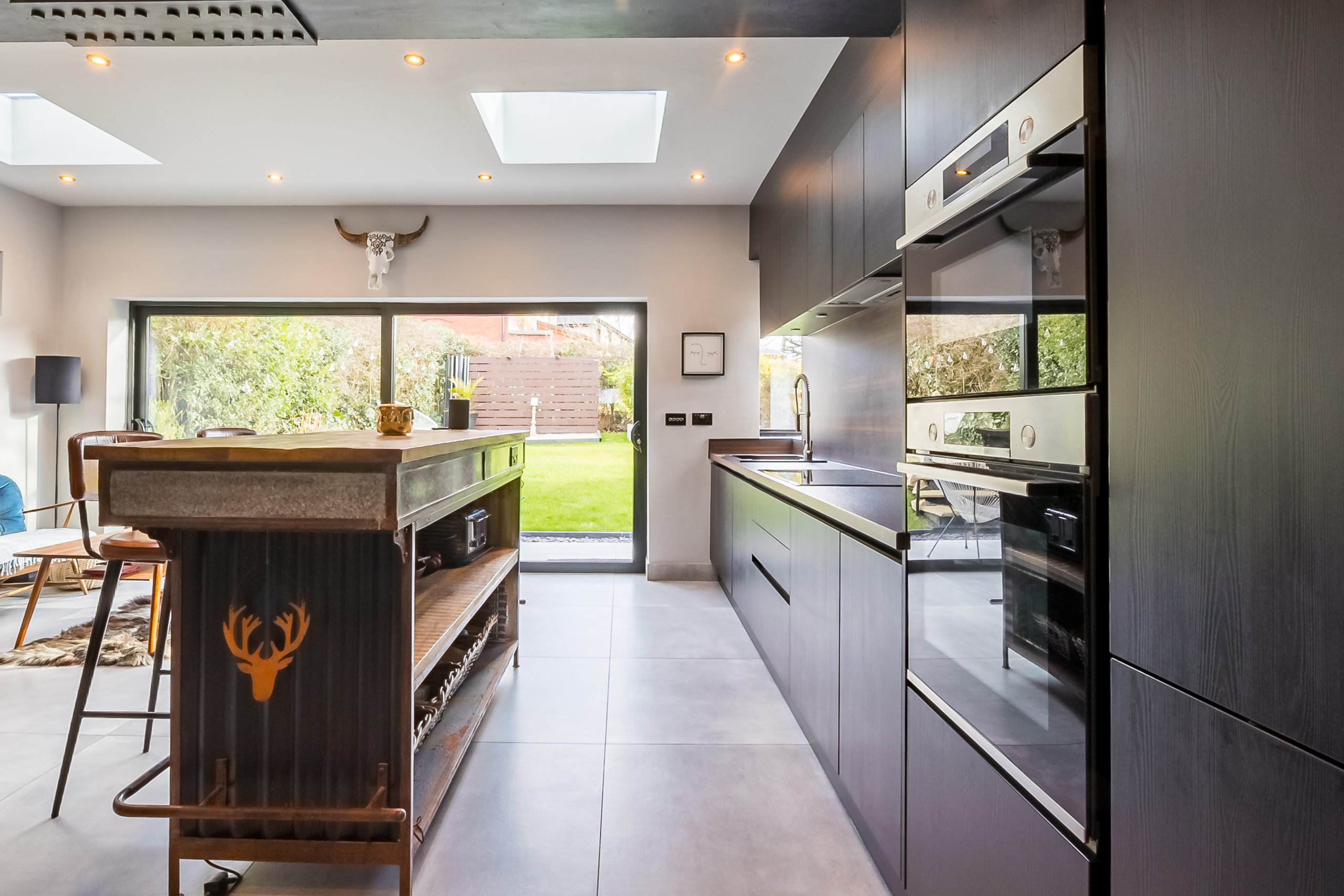 The dark and stylish kitchen sits in one block against a wall, opening out to a quirky central island table and comfortable seating alongside the expansive sliding doors out to the garden. It’s an unusual layout which looks amazing in this home.
