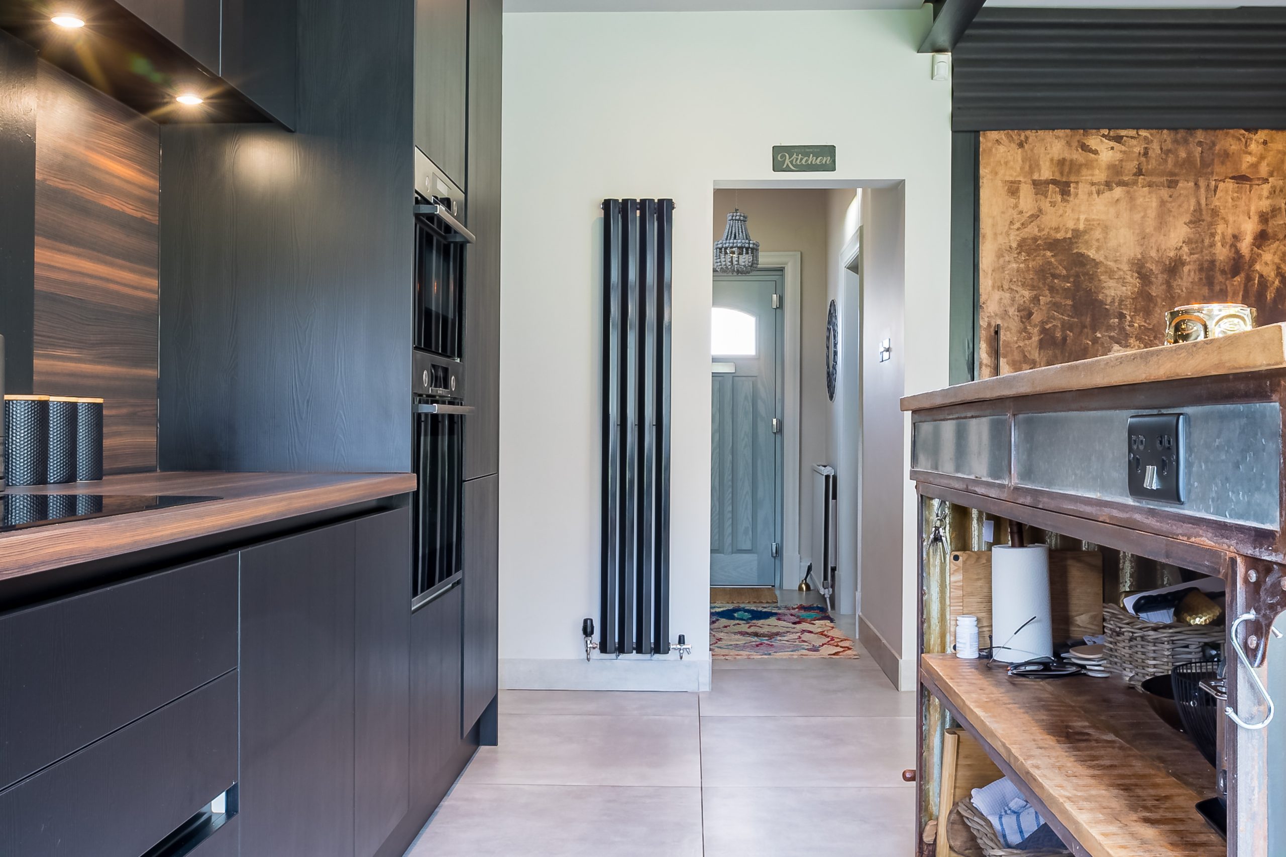 The matching sink is one-and-a-half sized for practicality, with a beautiful extending mixer tap setting it off wonderfully. Thermo pine is used for the worktop and upstands, giving a natural and luxurious look to the kitchen which complements the owner’s eclectic choice of room decorations and furniture.