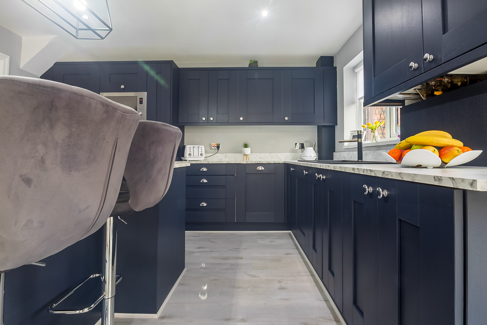 The central colour choice is the striking Cartmel Indigo dark blue shaker-style doors and drawer fronts with matching cornice, pelmet, plinths and panels. These are mounted onto 18mm PVC edged grey units which provide a lasting, robust construction. Chrome circular knobs on the doors and matching cup handles on the drawers look amazing, with soft closing hinges and drawers completing the top quality feel of this installation.