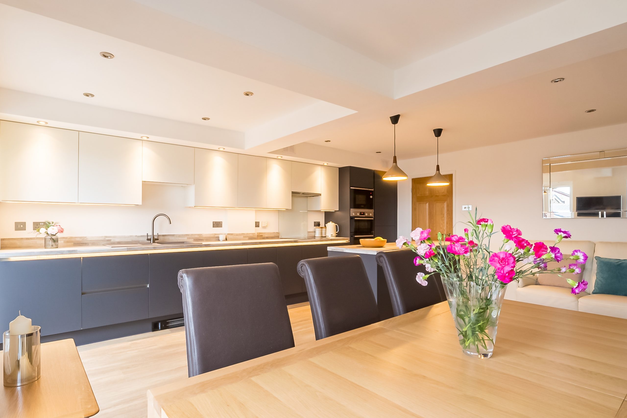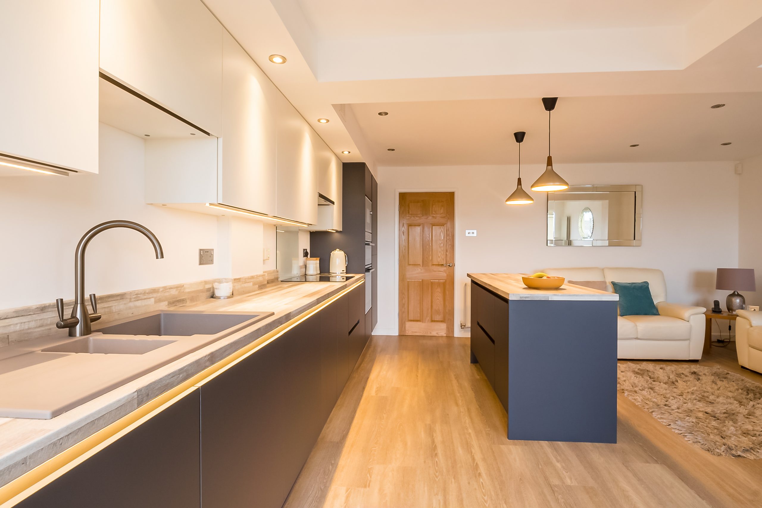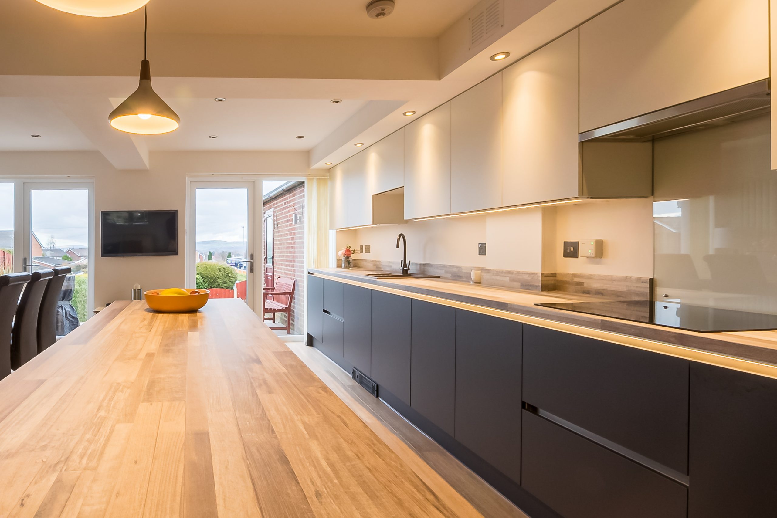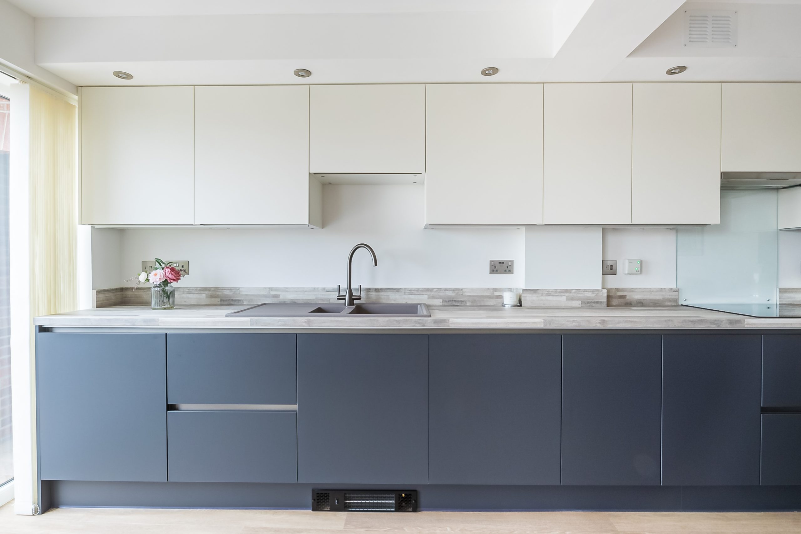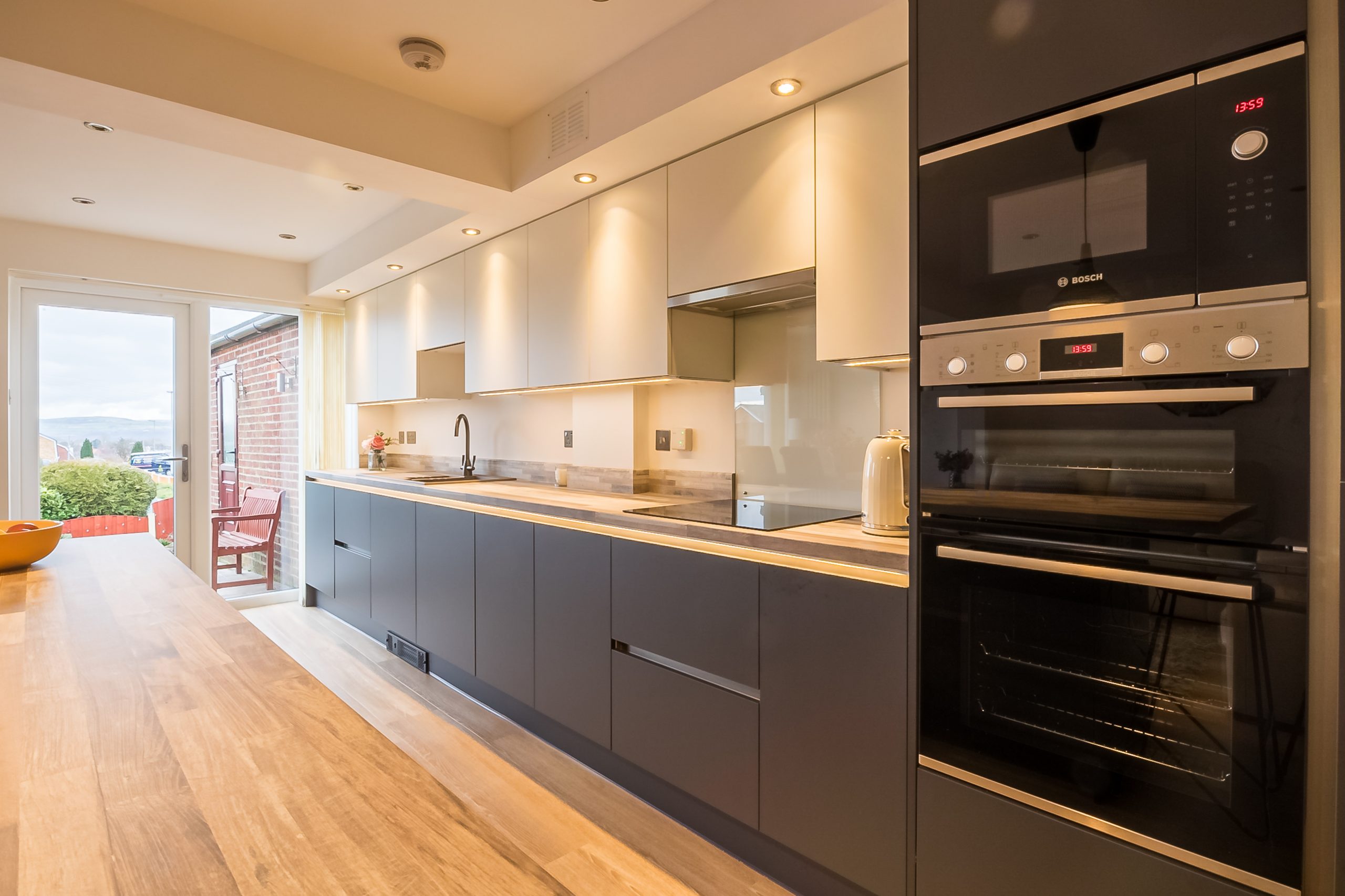 This Kitchen was built using Zola Matt Graphite & Porcelain Handleless Doors with soft close on those and the drawers.