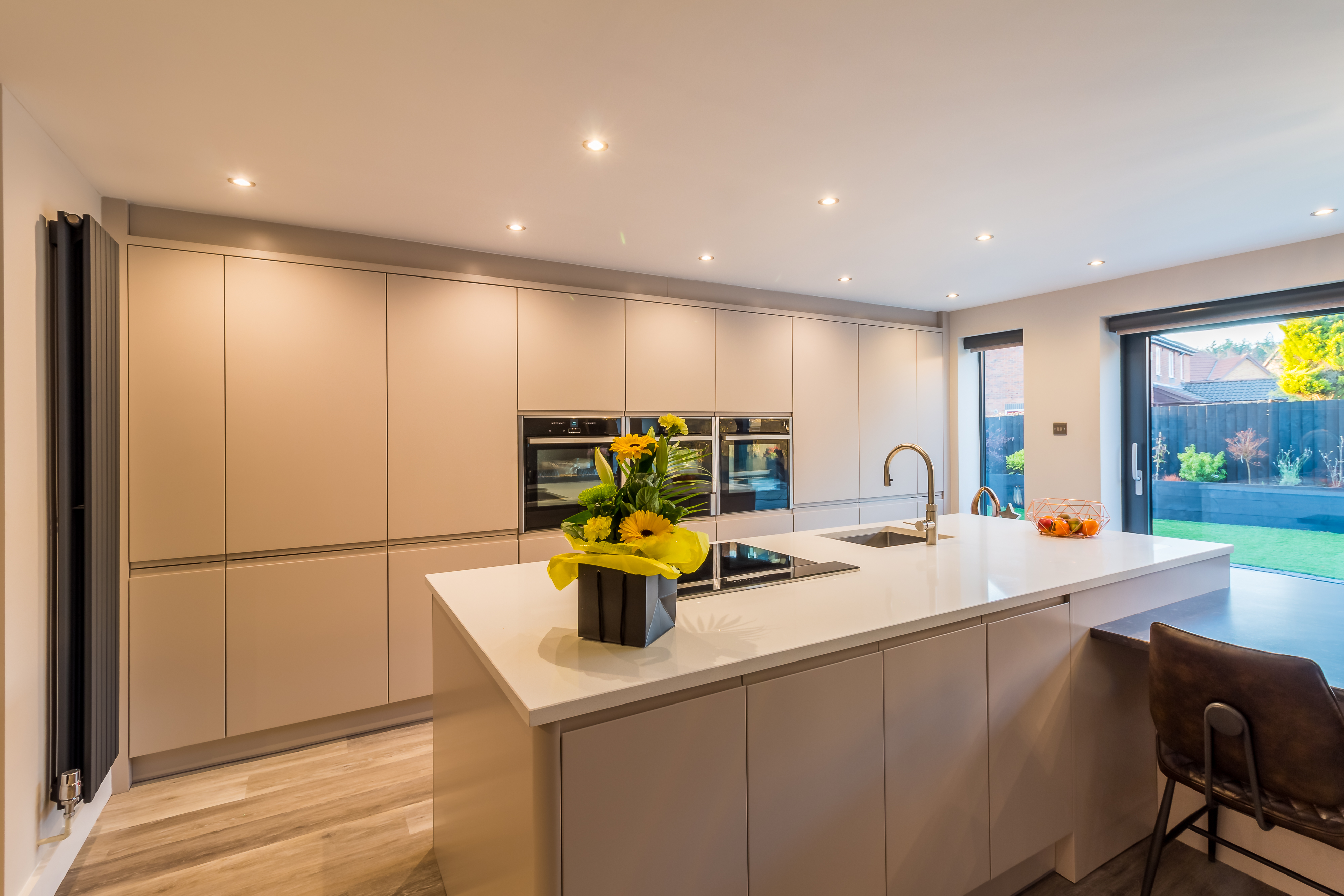 There are so many wonderful design features in this kitchen! A wall of matt finish cashmere handleless units gives a beautiful spacious feel from one end of the kitchen to the other, with three quality Neff ovens inset opposite an arctic snow quartz worktop island.