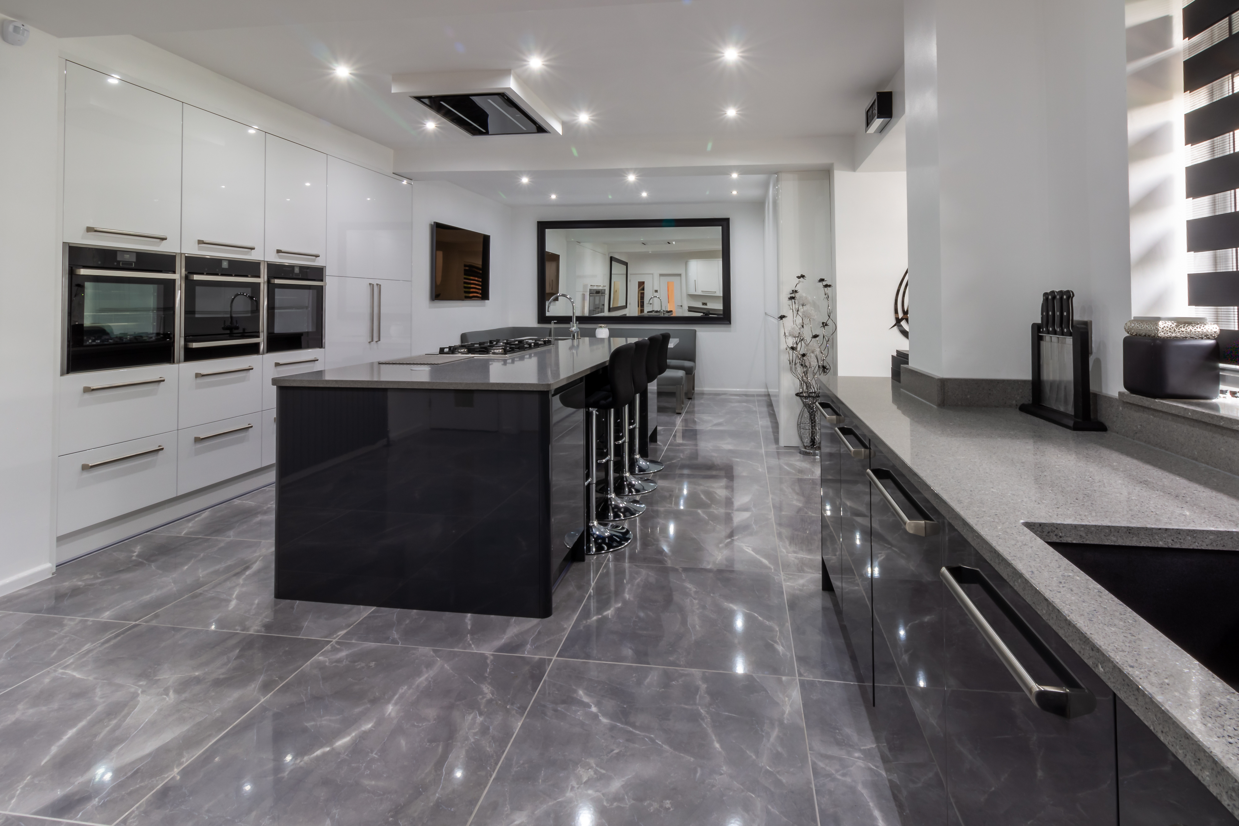 Chrome mirror chip quartz worktops extend throughout the room, with a central island containing a hob and sink for a hugely practical cooking area facing the customer’s own Neff ovens which are set beautifully into the fitted units.