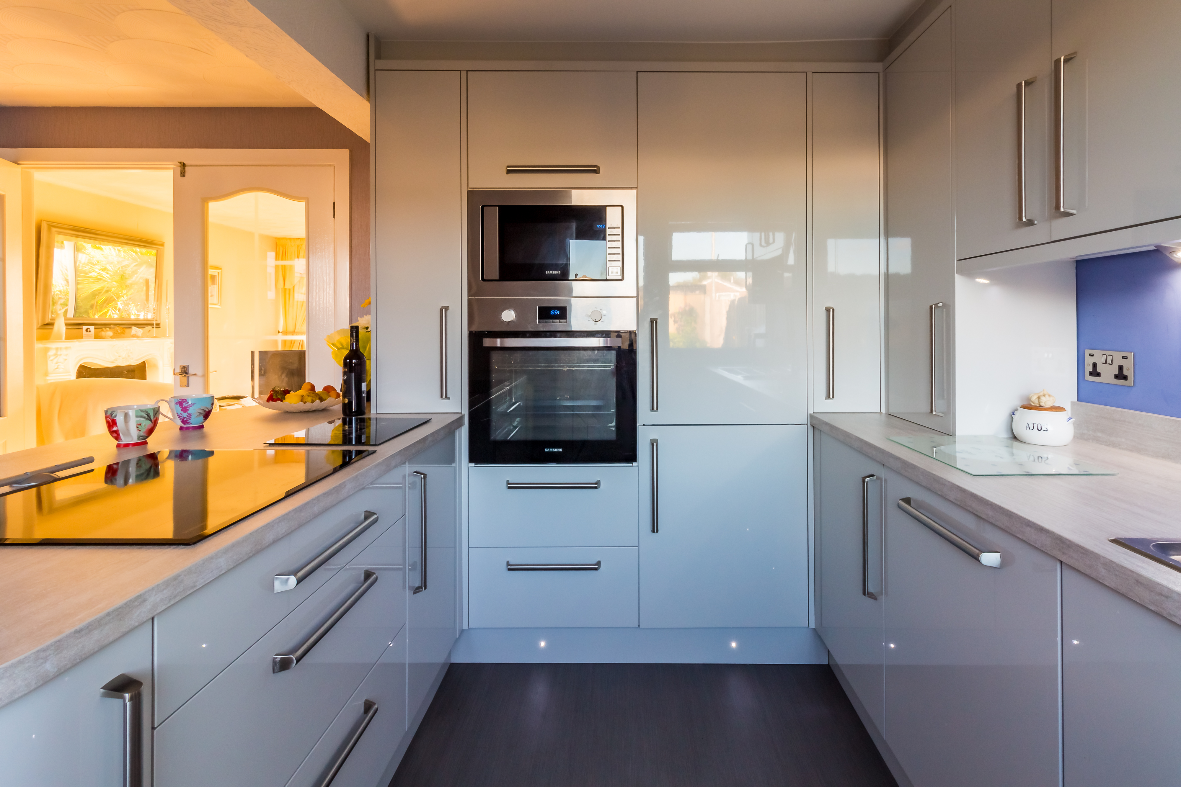 Slab grey gloss doors with brushed handles were fitted throughout to give an airy and light look incorporating floor-to-ceiling storage and a Samsung oven and microwave. The clever use of spot lighting and LED plinth lights completes a kitchen which Mrs S will love for years to come.